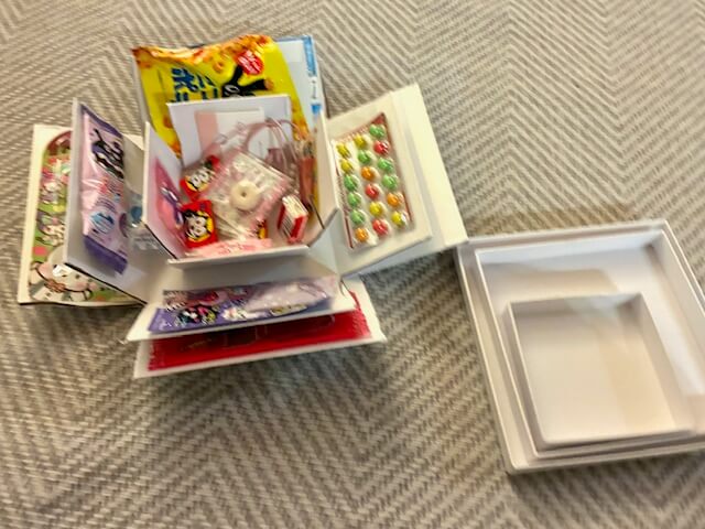 マトリョーシカのように段々と小さい箱が出て来ては、ふたを開けると壁面が外側に倒れ、箱ごとにお菓子があるシステム。